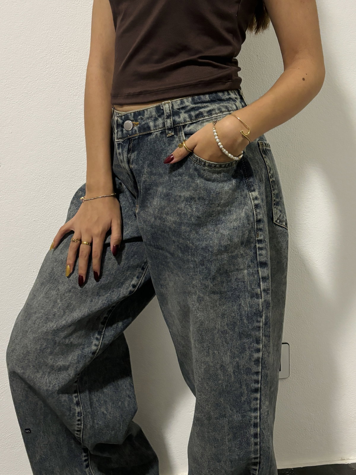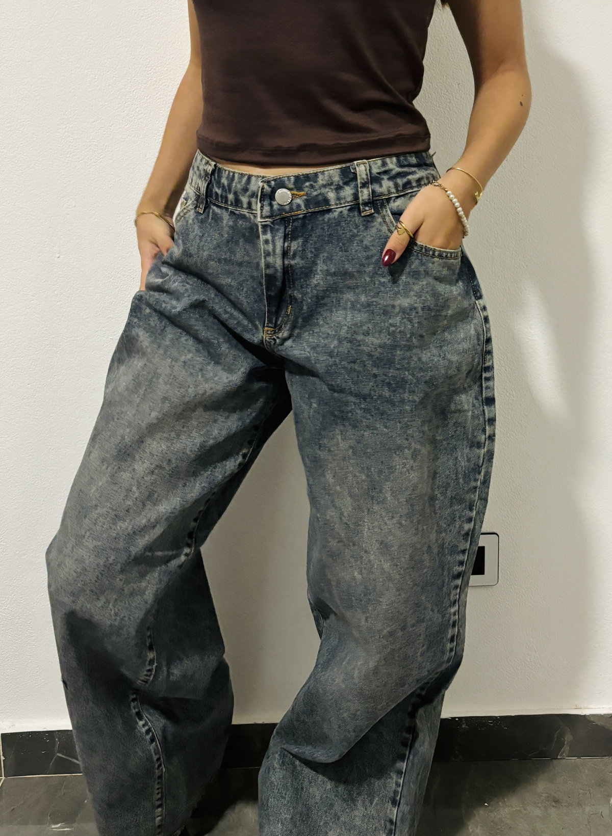es de un color azulado/grisáceo. De tiro medio/bajo, super ancho siendo wide leg y de calidad superior.