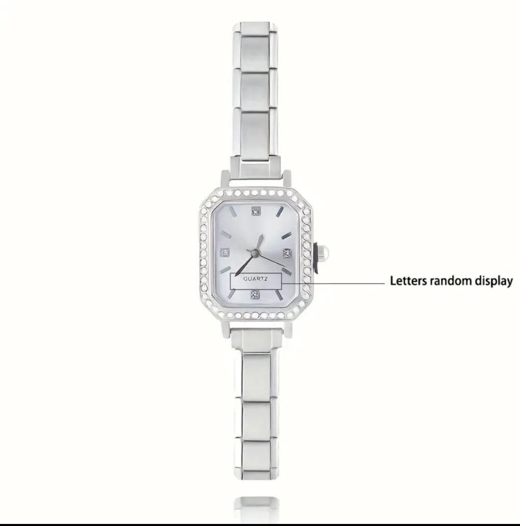 el reloj cuenta con 15 charms lisos, pieza de acero inoxidable. Incrustaciones con cristales.