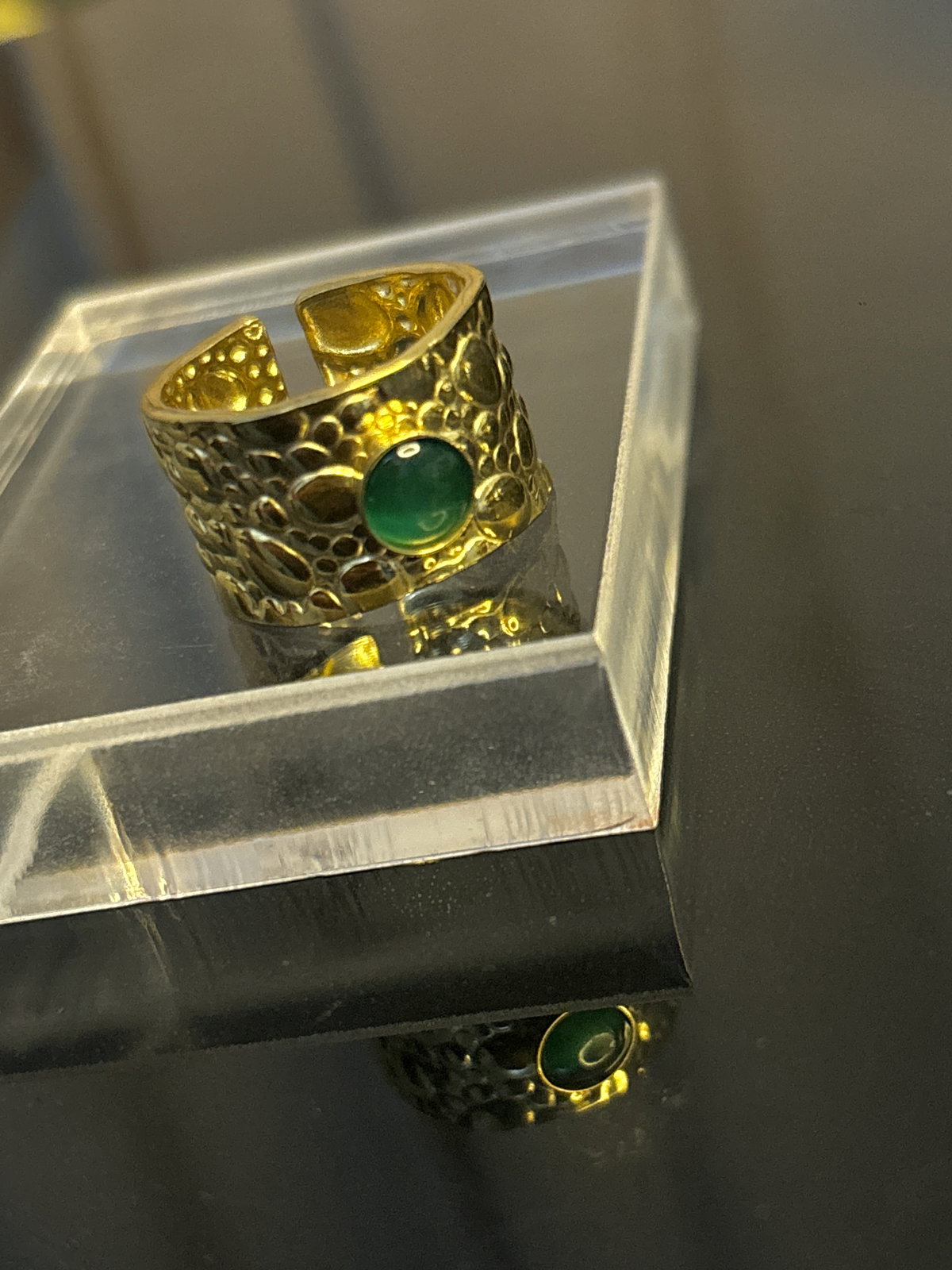 Aurum Green — Su nombre une el brillo del oro (Aurum) con la fuerza del verde profundo. Un anillo que combina elegancia y vitalidad, reflejando equilibrio entre lujo y naturaleza.