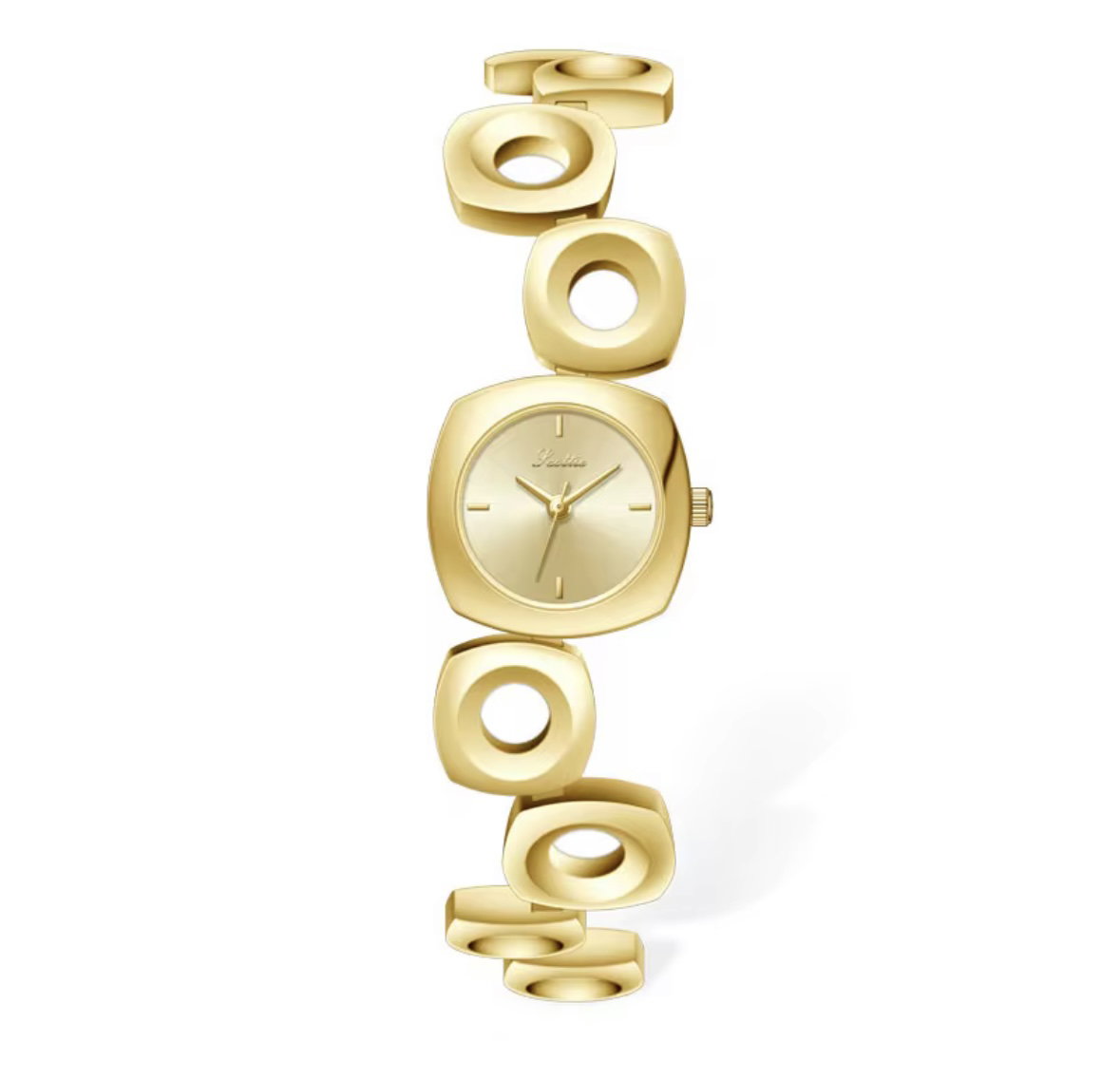 El reloj LYRA grita actitud dorada. Su diseño de acero inoxidable con eslabones circulares y brillo espejo no pasa desapercibido: es una pieza moderna, audaz y con presencia. Ideal para quienes no siguen tendencias, las crean.
