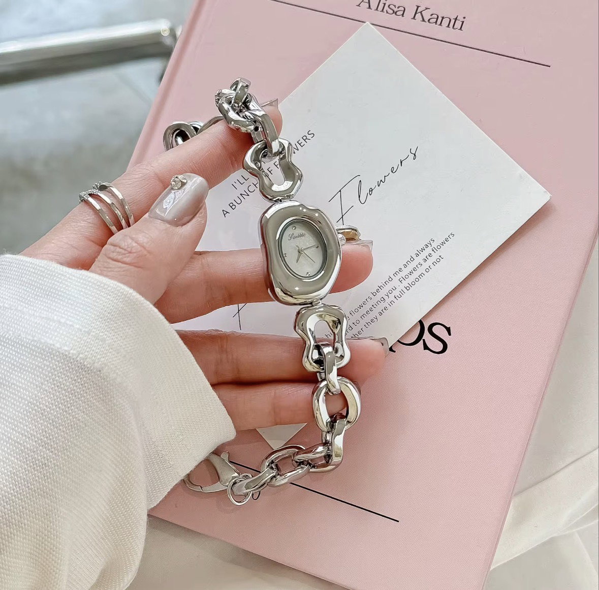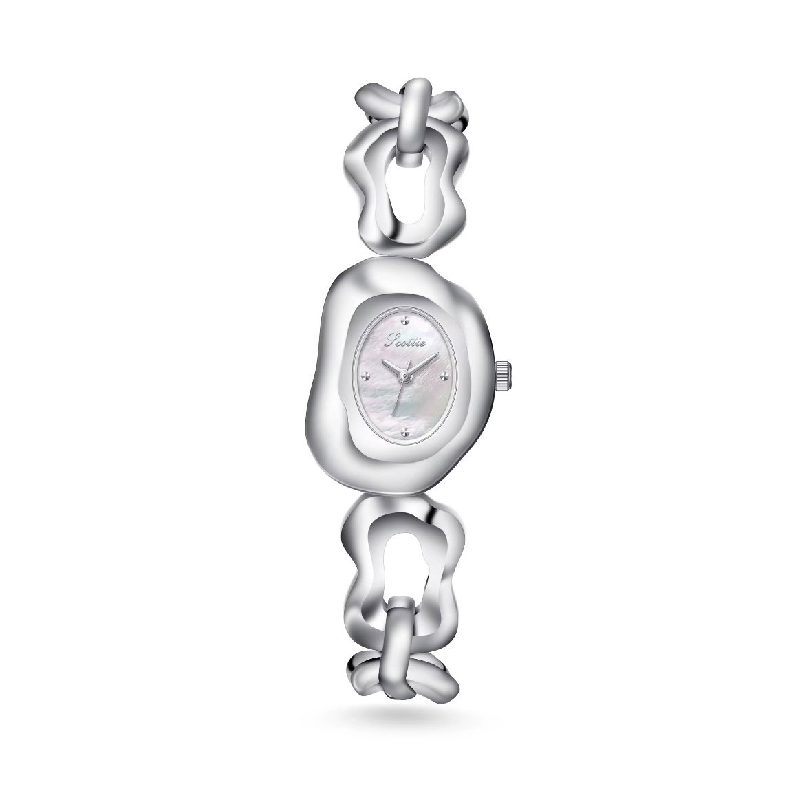 IRREGIA – fusión de irregular y regia (real); un lujo que rompe reglas. Un diseño que parece esculpido por la naturaleza. Este reloj plateado, con líneas orgánicas y una esfera nacarada que refleja luces suaves, transmite una energía viva y etérea. Es una pieza que celebra la imperfección perfecta, la fluidez y el arte en movimiento.