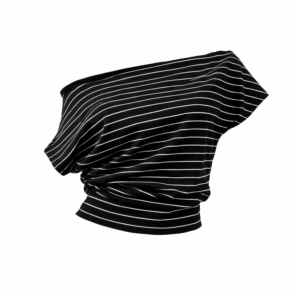 Stripe Off Shoulder es la remera perfecta para un look moderno, canchero y sin esfuerzo. Su diseño de un solo hombro aporta un toque sexy y sofisticado, mientras que las líneas finas en contraste estilizan la silueta y suman una vibra urbana súper trendy.